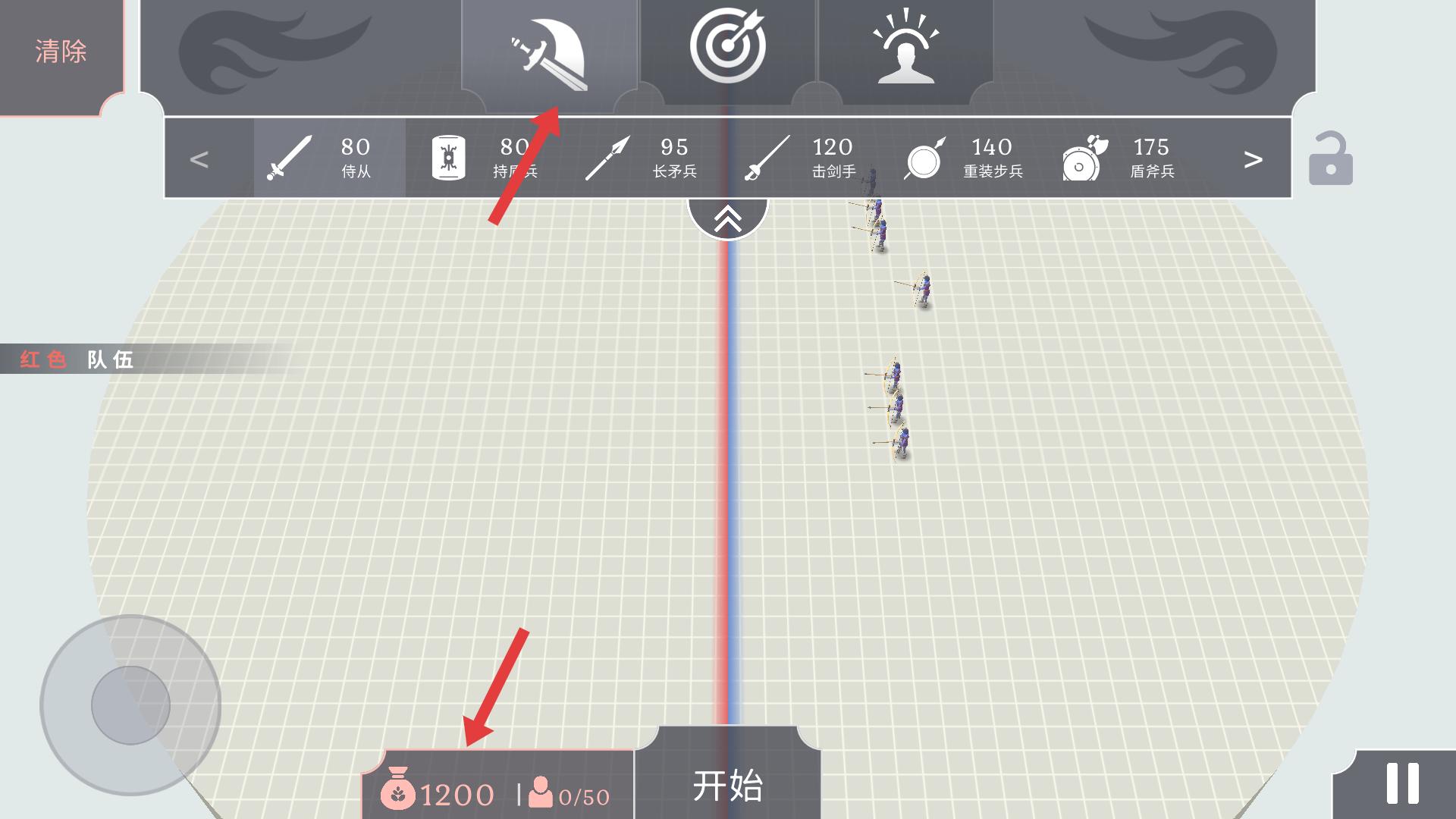 2、在戰(zhàn)斗部署界面,上方有侍從,持盾兵等兵種可選,下方顯示擁有的貨幣和可部署的兵力上限,選擇兵種后可在左側(cè)部署。