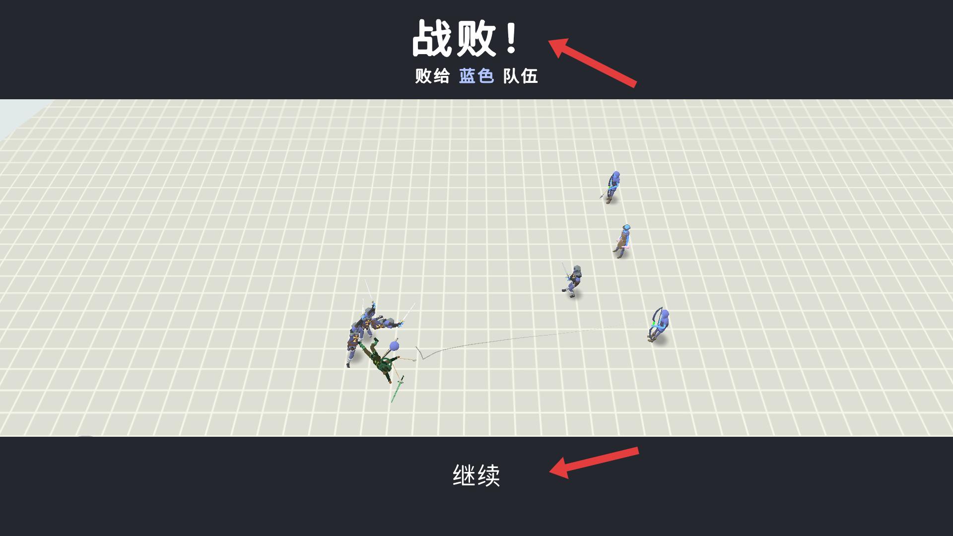 4、若己方部隊敗給藍色隊伍,會出現(xiàn)戰(zhàn)敗界面,顯示敗給藍色隊伍,點擊繼續(xù)可重新開始戰(zhàn)斗或進行其他操作。