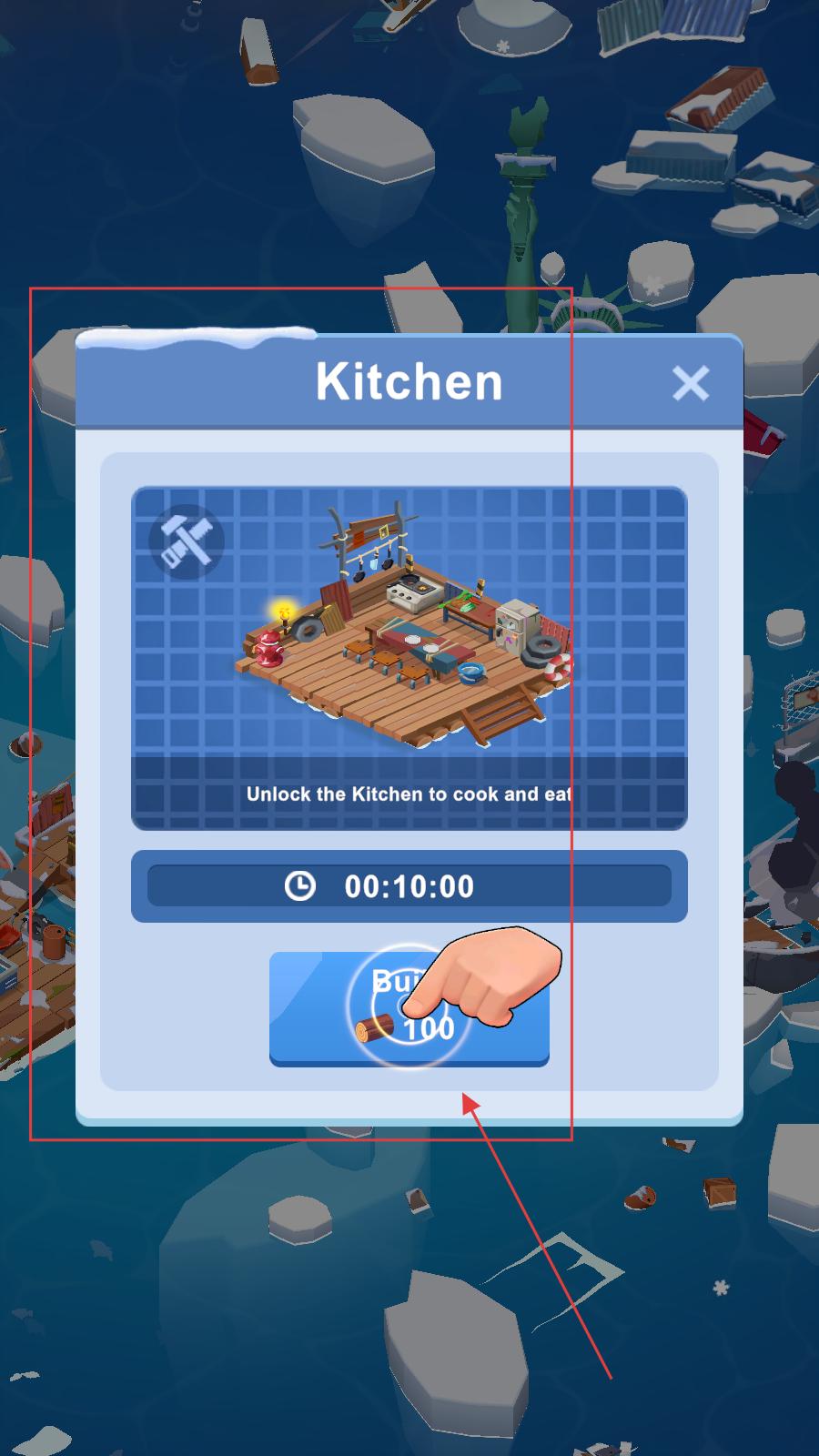 4、玩家可點擊場景中的按鈕,加速廚房的建造進程,盡快解鎖烹飪功能,為后續(xù)的生存發(fā)展奠定基礎。