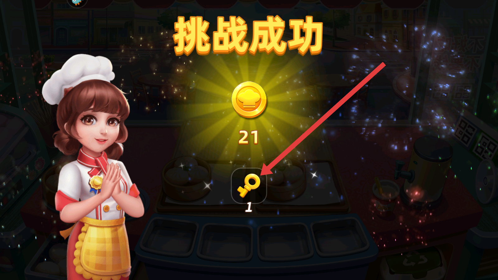 4、完成關(guān)卡目標后,會出現(xiàn)挑戰(zhàn)成功界面,獲得金幣和鑰匙獎勵,鑰匙可用于解鎖新內(nèi)容,繼續(xù)經(jīng)營之旅。