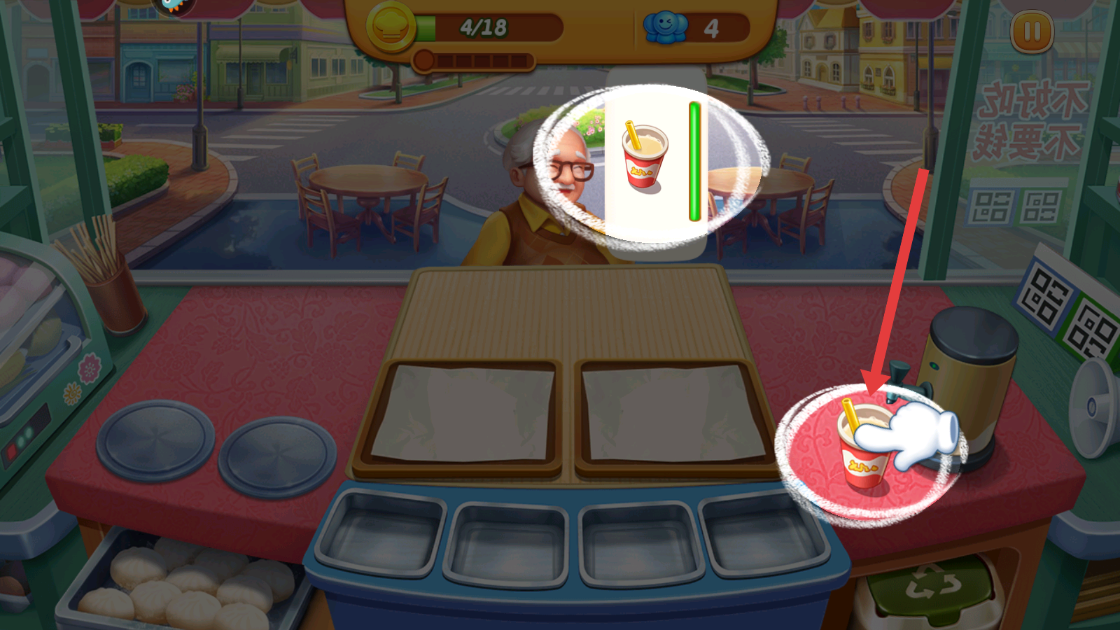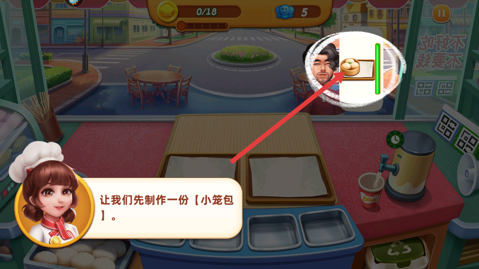 1、進入游戲場景,根據(jù)提示制作小籠包,需關(guān)注顧客需求,及時準備對應餐品,開啟早餐店經(jīng)營挑戰(zhàn)。