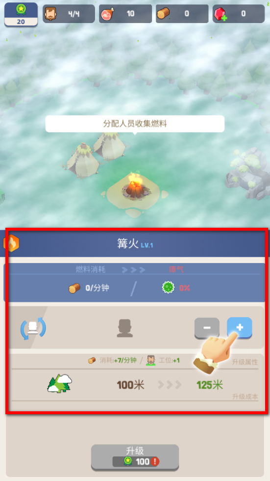 2、進入篝火界面后,點擊加號分配人員收集燃料,燃料消耗和士氣等屬性會隨之變化,分配人員保障篝火持續(xù)運作。