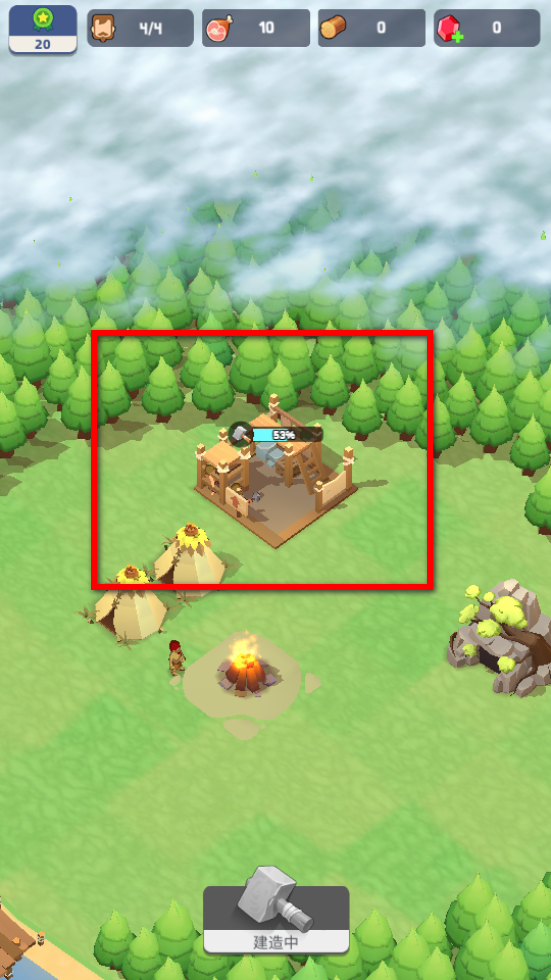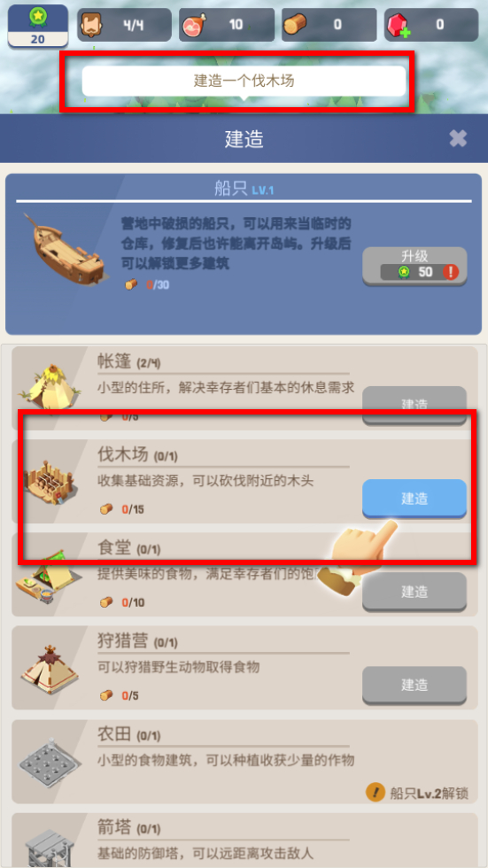 3、建造伐木場,需消耗一定資源,建造過程有進度顯示,建成后可砍伐附近木頭獲取資源,伐木場是獲取基礎(chǔ)資源的重要建筑。