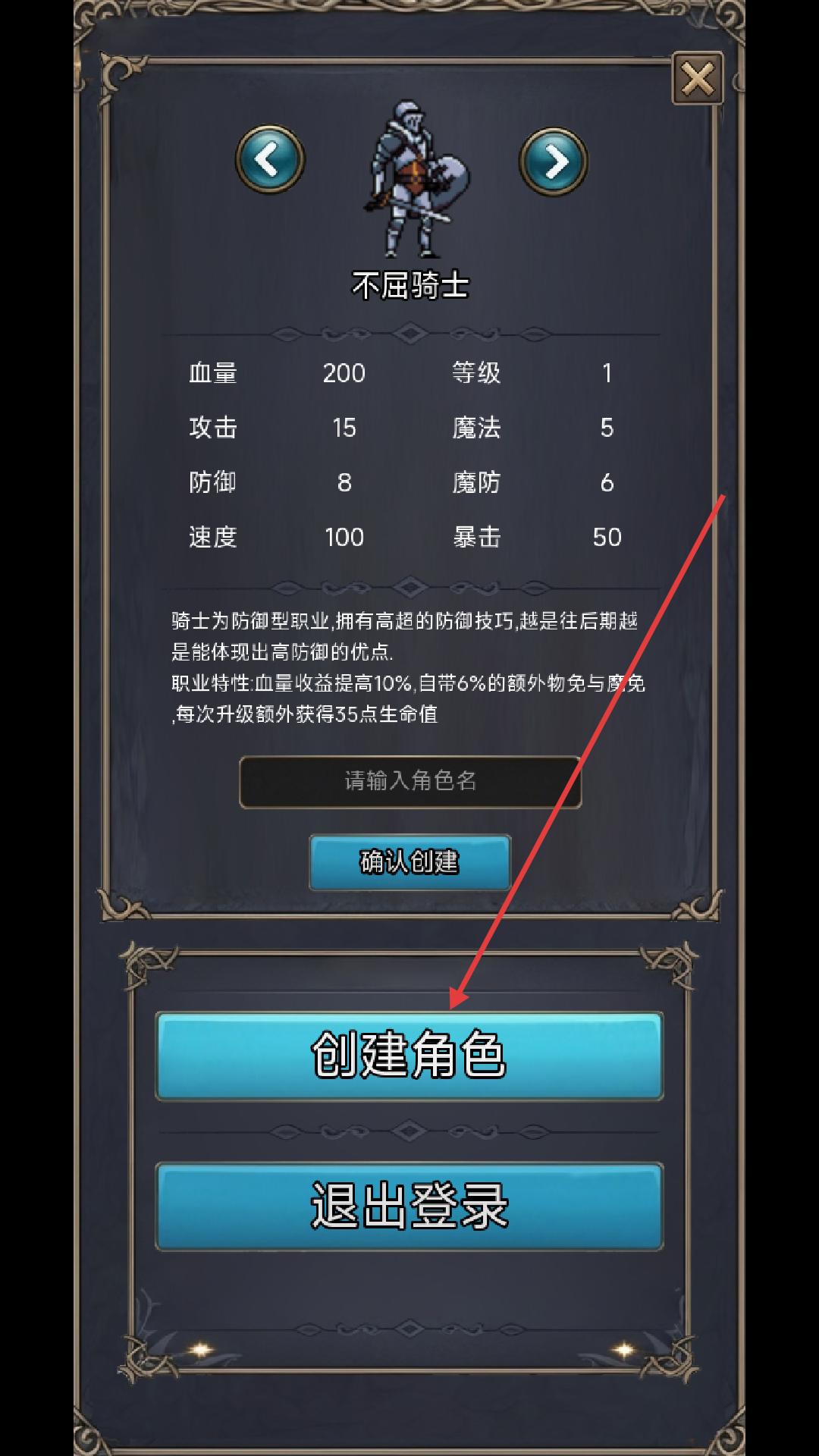 2、選擇不屈騎士職業(yè),輸入角色名后再次點(diǎn)擊確認(rèn)創(chuàng)建,完成角色創(chuàng)建,該職業(yè)防御能力強(qiáng),適合新手選擇。