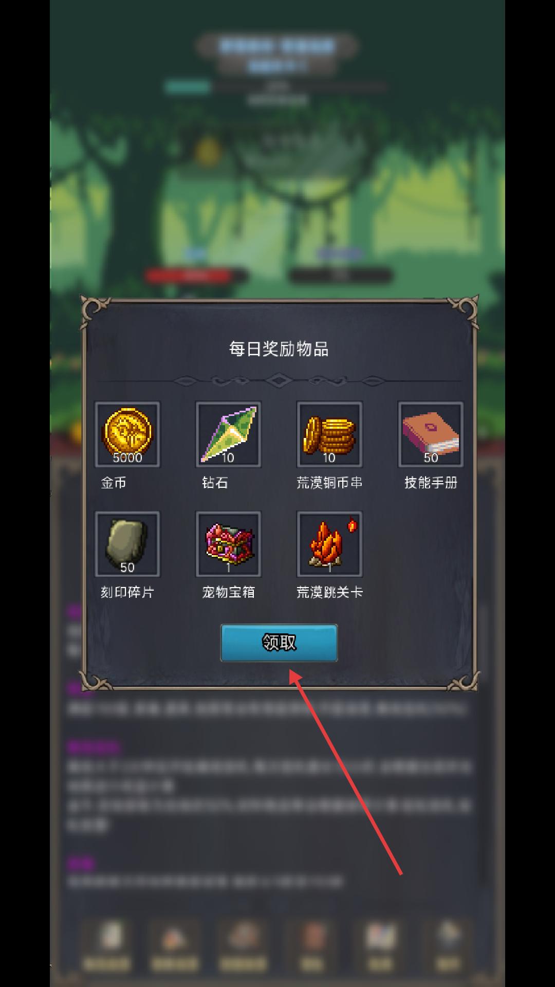 4、點(diǎn)擊領(lǐng)取按鈕,獲取每日獎(jiǎng)勵(lì)物品,包括金幣、鉆石等資源,這些資源可用于提升角色和裝備。
