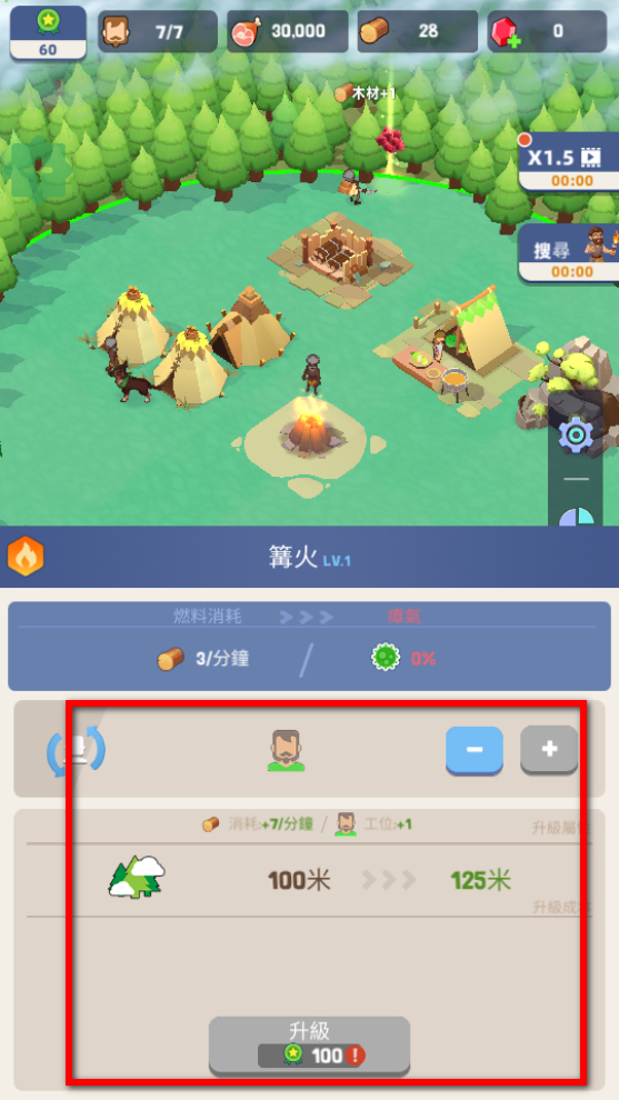 1、在篝火界面,可通過(guò)加減號(hào)調(diào)整人員分配,消耗資源升級(jí)篝火,升級(jí)后探索范圍擴(kuò)大,合理操作能提升營(yíng)地生存與發(fā)展的基礎(chǔ)能力。