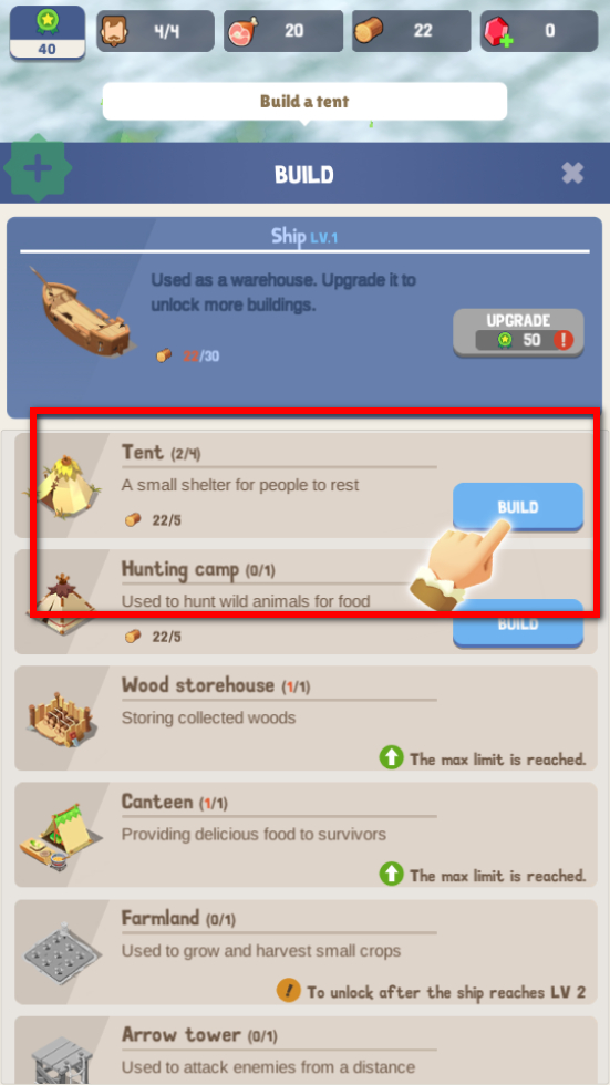 3、在建造界面找到帳篷,點(diǎn)擊建造按鈕消耗資源建造,帳篷作為小型庇護(hù)所供人員休息,建造后可提升營(yíng)地容納人員的能力。