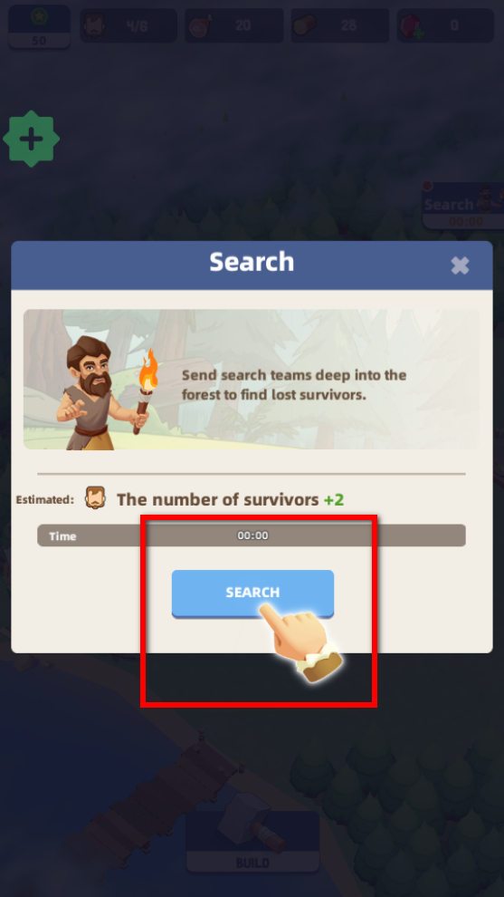 4、點(diǎn)擊搜索按鈕,派遣搜索隊(duì)深入森林尋找失蹤幸存者,完成搜索可增加幸存者數(shù)量,為營(yíng)地發(fā)展提供更多人力支持。