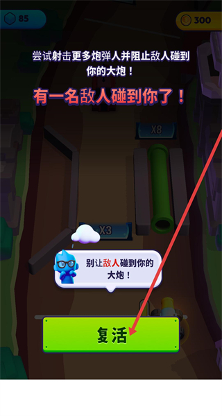1、玩家控制大炮當(dāng)敵人碰到大炮失敗時(shí)點(diǎn)擊復(fù)活按鈕,即可重新挑戰(zhàn)關(guān)卡注意射擊彈彈人阻止敵人靠近。