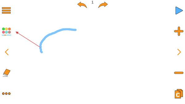 1、選擇不同顏色的畫(huà)筆如彩色圓點(diǎn)標(biāo)識(shí)的顏色選項(xiàng),在畫(huà)布上繪制線條、圖形,為動(dòng)畫(huà)創(chuàng)作奠定基礎(chǔ)畫(huà)面。