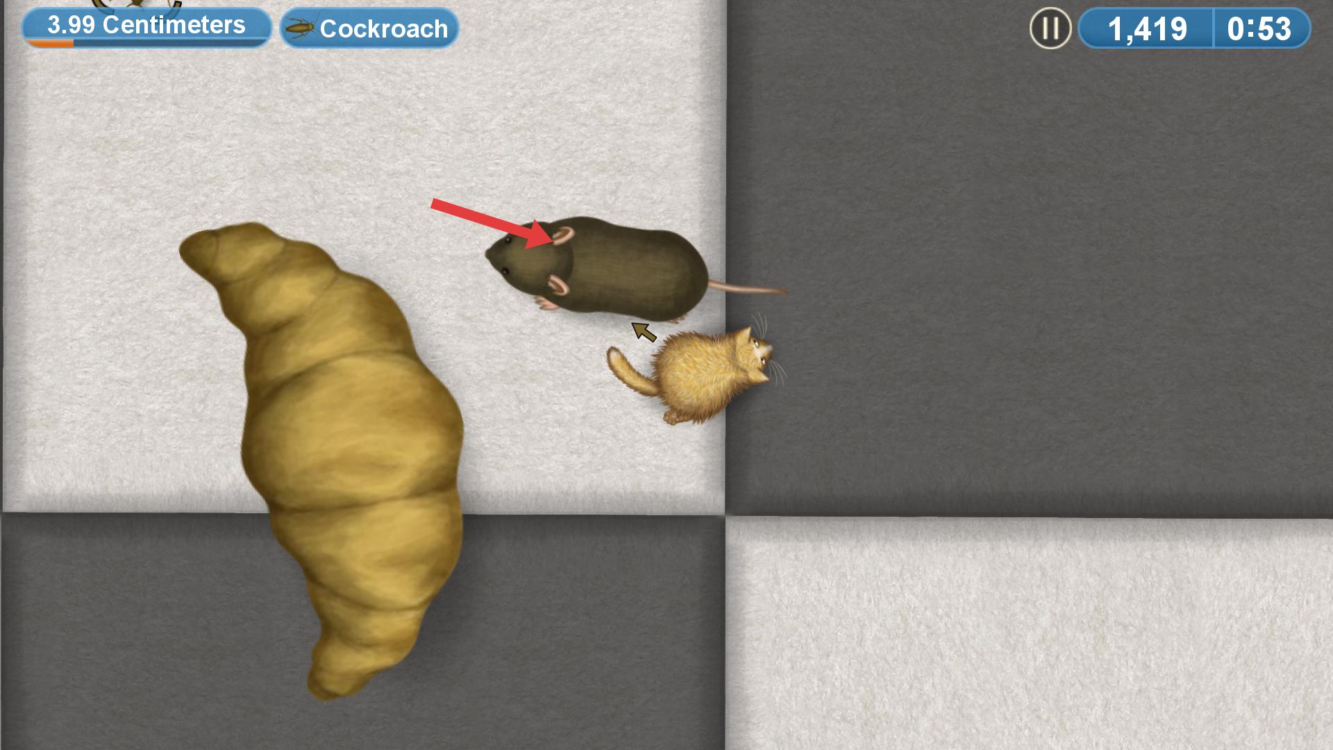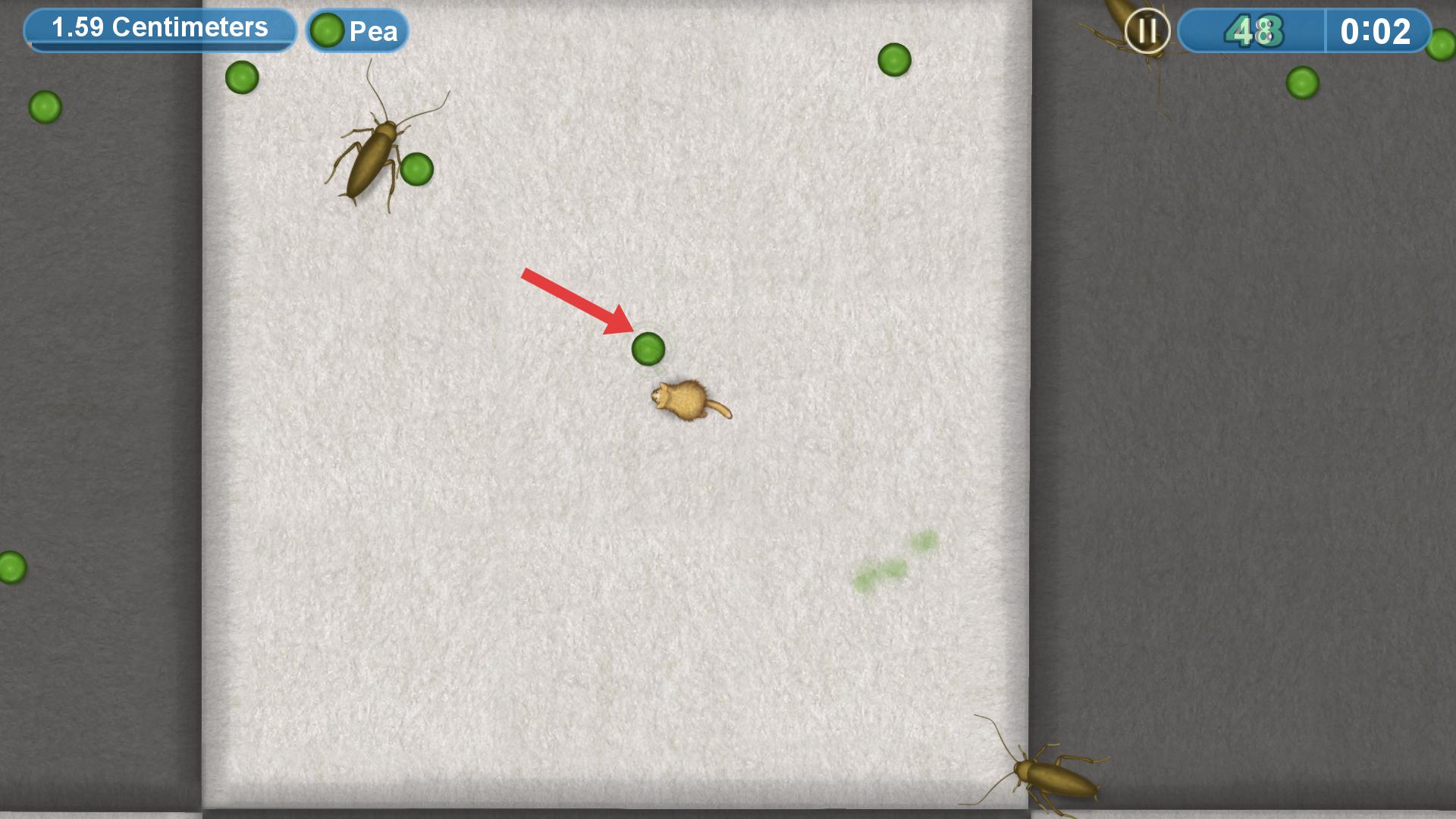 4、游戲中需關注自身尺寸和可食用目標,如遇到老鼠這類比自己大的生物要避開,優(yōu)先尋找可食用的小物體來增大自身尺寸,同時留意時間和分數(shù)變化。