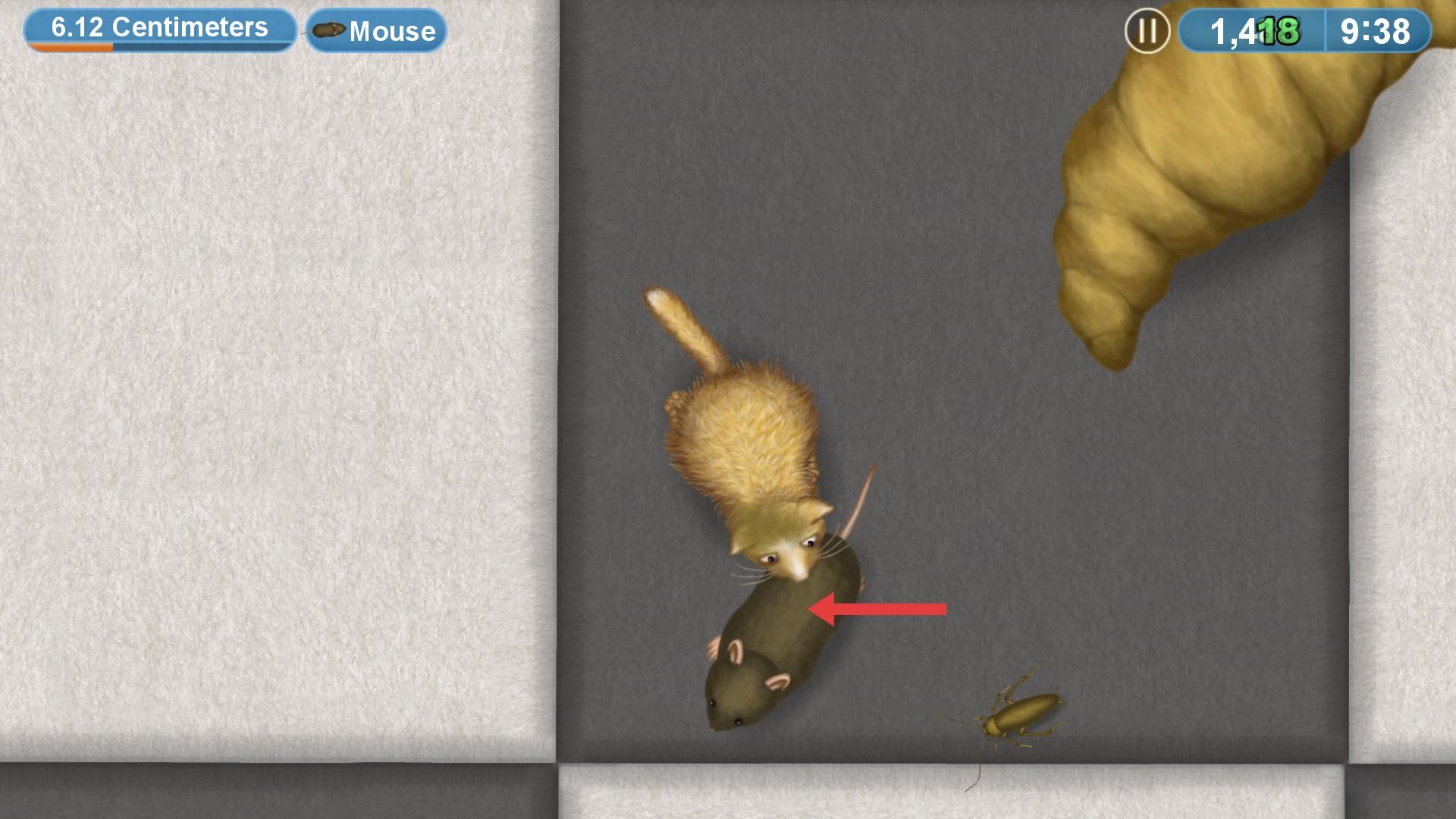 3、當(dāng)尺寸進(jìn)一步增長(zhǎng)后,可嘗試吞噬老鼠這類比之前可食用目標(biāo)更大的生物,繼續(xù)積累尺寸以便后續(xù)吞噬更大的物體,注意場(chǎng)景中物體的分布。