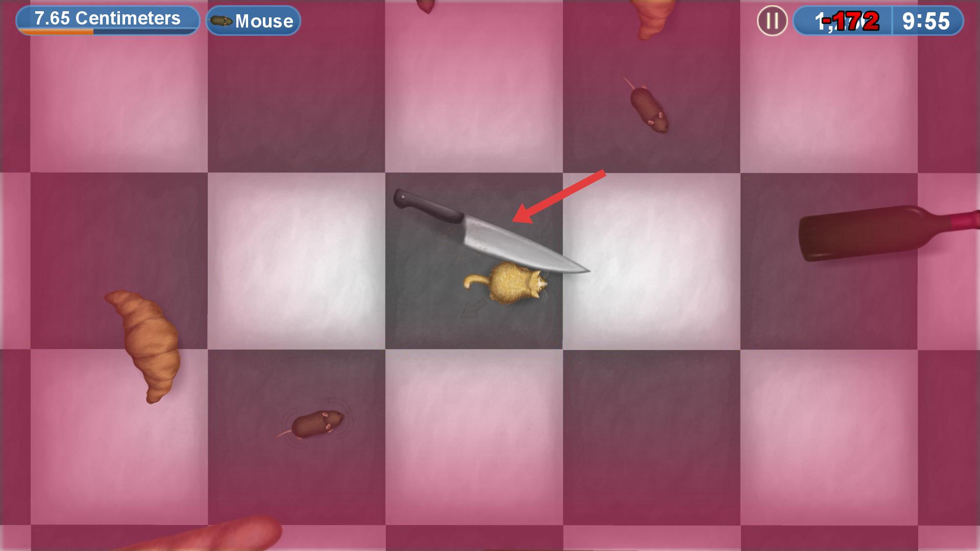 4、遇到刀具這類危險(xiǎn)物體時(shí)要避開(kāi),優(yōu)先選擇可食用的老鼠、食物等物體來(lái)增大自身尺寸,合理規(guī)劃移動(dòng)路線以高效吞噬成長(zhǎng)并規(guī)避危險(xiǎn)。