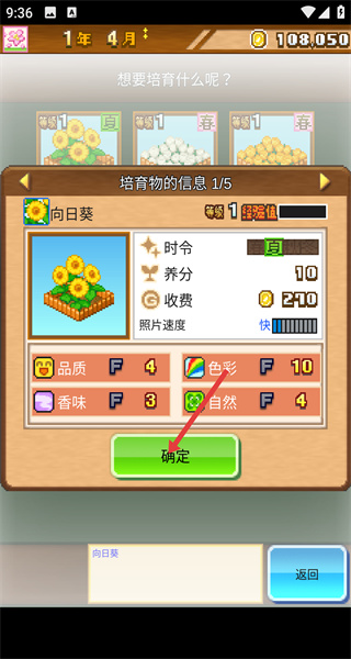 4、選擇要培育的植物,查看其信息后點(diǎn)擊確定,開(kāi)始培育植物,推進(jìn)牧場(chǎng)的經(jīng)營(yíng)。