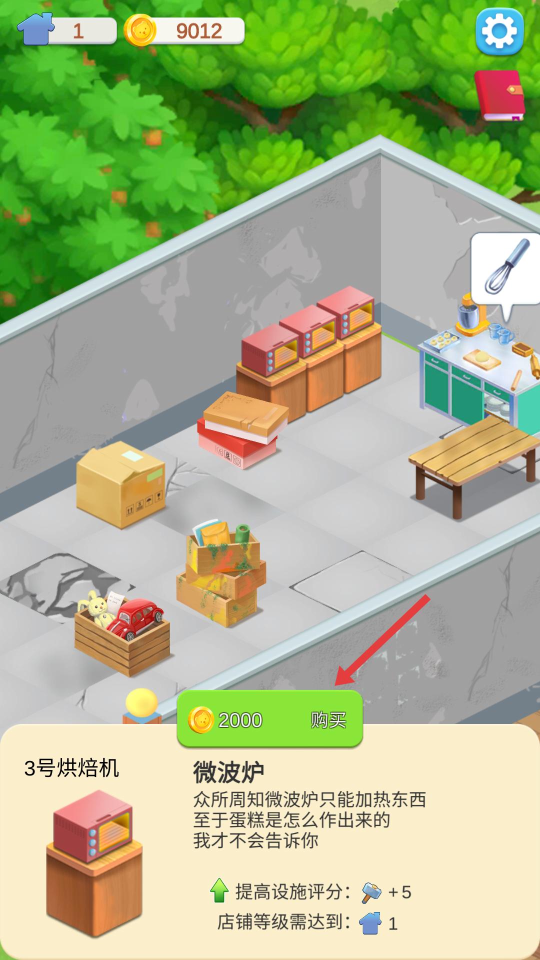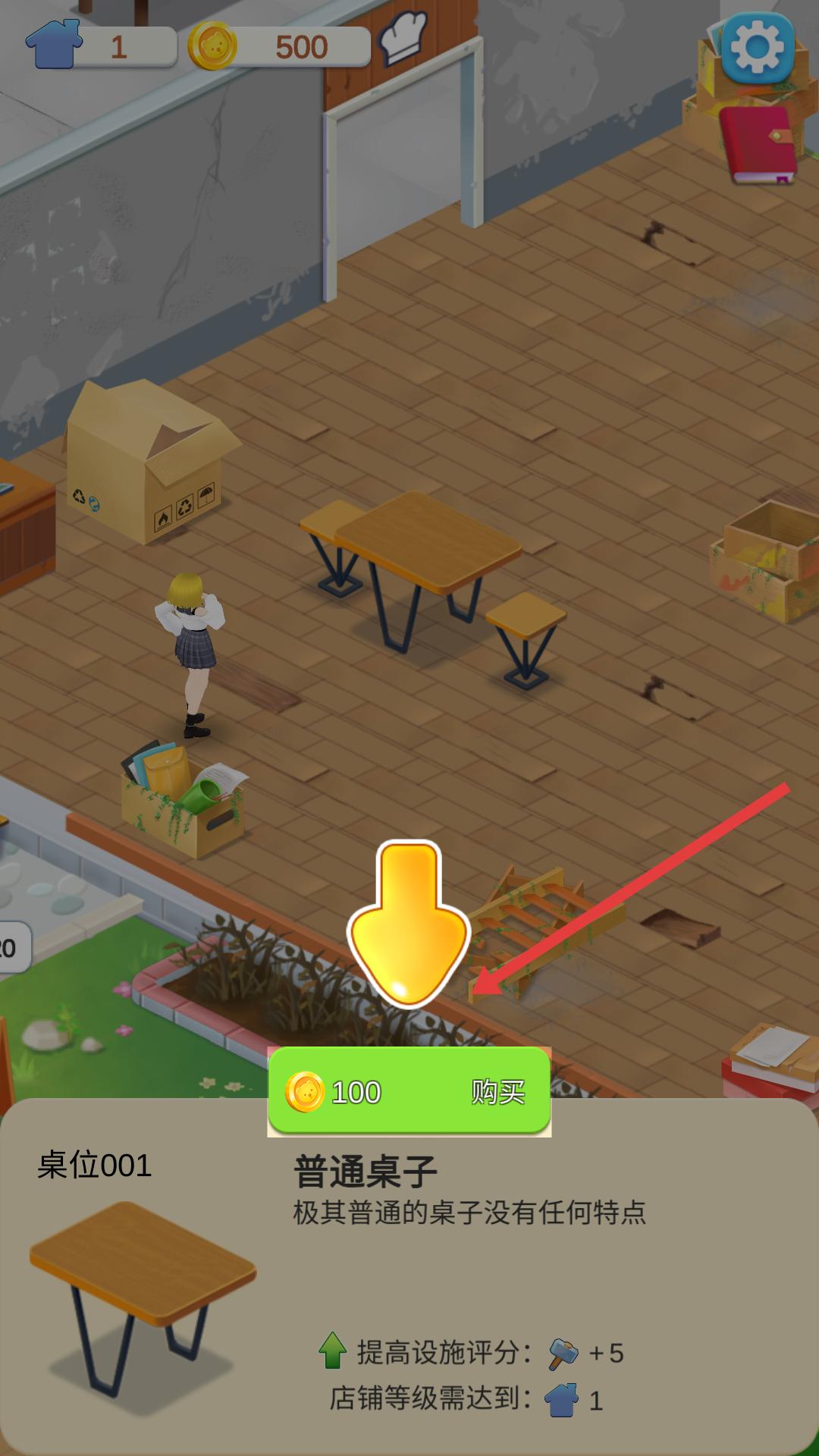1、根據(jù)提示購買設(shè)施,如普通桌子、微波爐等,提升店鋪的設(shè)施評分,為店鋪經(jīng)營奠定基礎(chǔ)。
