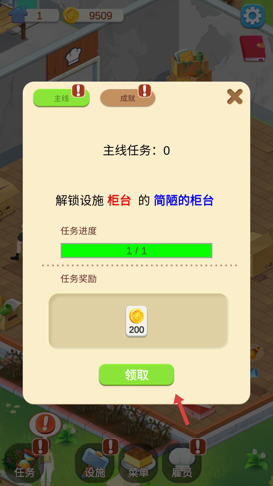 2、完成主線任務(wù),如解鎖簡陋的柜臺,領(lǐng)取任務(wù)獎勵(lì),獲取金幣等資源,用于店鋪的進(jìn)一步發(fā)展。