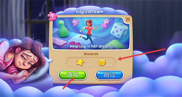 2、玩家還會遇到茉莉的Dream夢境環(huán)節(jié),若想拿更多獎勵星星金幣,可以點擊游戲參與如果不需要可以選跳過。