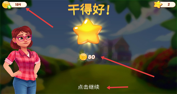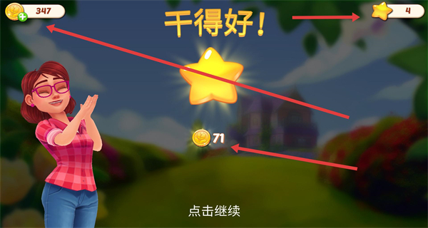 1、玩家關(guān)卡成功后出現(xiàn)干得好界面,能夠根據(jù)獎勵獲取金幣和星星獎勵,點擊點擊繼續(xù)進入下一關(guān)。