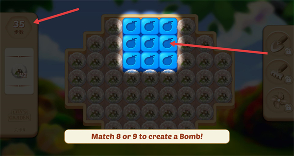 3、玩家新消除關(guān)卡需要留意步數(shù)限制如35步,按提示匹配8到9個同色方塊造炸彈快速清場,剩余步數(shù)越多拿到的金幣越多。