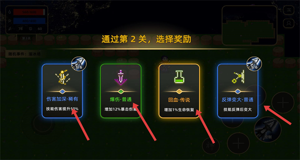 4、成功通關(guān)后會(huì)出現(xiàn)獎(jiǎng)勵(lì)選擇界面,界面中有傷害加深回血和防御提升三種獎(jiǎng)勵(lì),優(yōu)先選擇契合自身流派的追求輸出就選傷害加深。