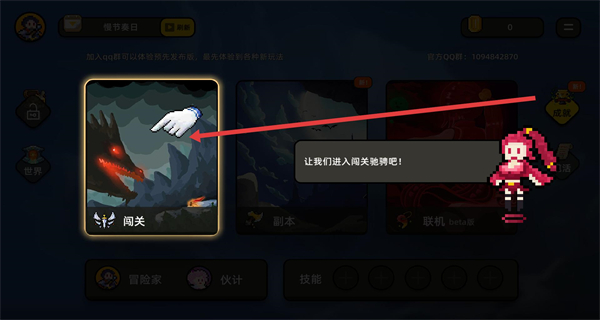1、進(jìn)入游戲主界面先查看底部功能欄,點(diǎn)擊闖關(guān)選項(xiàng)進(jìn)入關(guān)卡列表,選擇標(biāo)注新手推薦的第一關(guān),點(diǎn)擊確認(rèn)后開啟冒險(xiǎn)跟隨初始劇情指引熟悉基本操作和戰(zhàn)斗規(guī)則。
