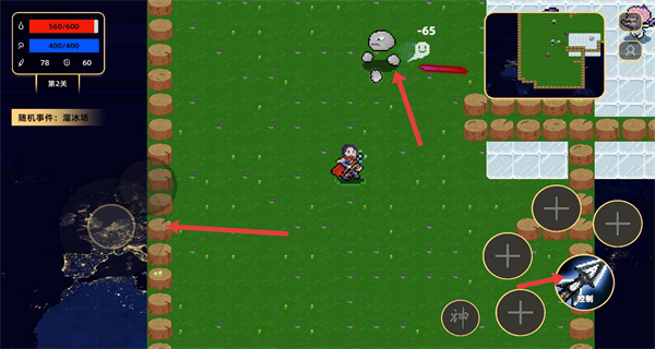 3、進(jìn)入戰(zhàn)斗場景后屏幕左下角是虛擬搖桿,拖動(dòng)可操控角色上下左右移動(dòng),右下角有普通攻擊和技能釋放按鈕,攻擊怪物時(shí)注意觀察其攻擊軌跡及時(shí)移動(dòng)躲避避免掉血。