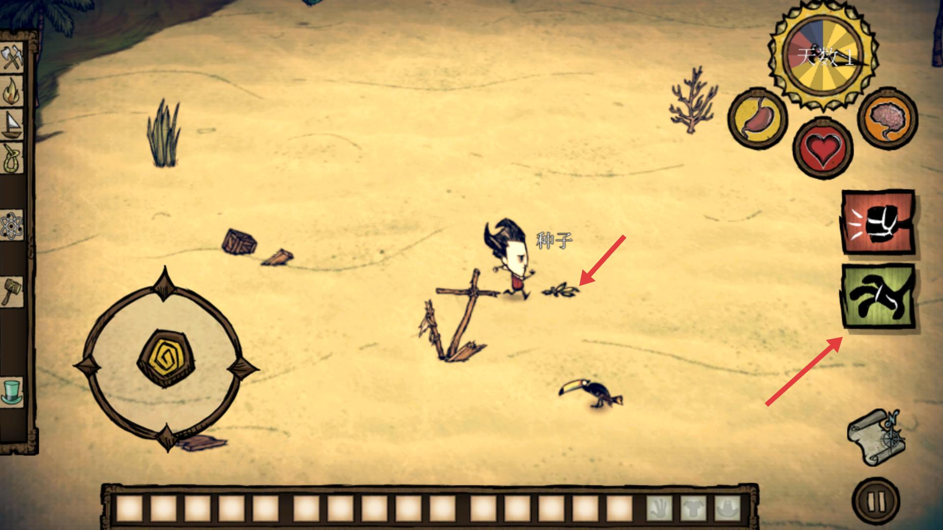 3、看到種子等資源時(shí),點(diǎn)擊右側(cè)拾取按鈕可將其收集,收集后資源會(huì)進(jìn)入物品欄,方便后續(xù)使用,同時(shí)要留意場景中其他可收集的物資。