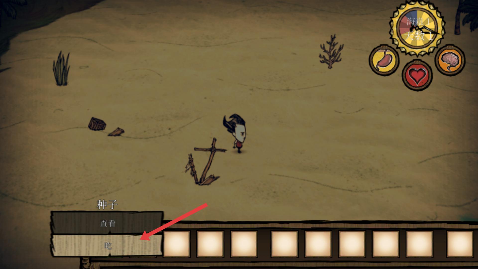 4、當(dāng)饑餓值下降時(shí),可在物品欄中選擇種子,點(diǎn)擊【吃】來補(bǔ)充饑餓值,確保角色能持續(xù)生存,同時(shí)注意合理分配資源。