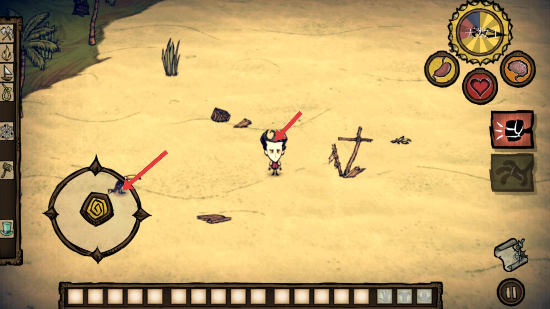 2、進(jìn)入游戲后,通過左側(cè)操控盤控制角色移動(dòng),需時(shí)刻關(guān)注右上角的生命值、饑餓值、精神值,在場景中收集資源以維持生存。