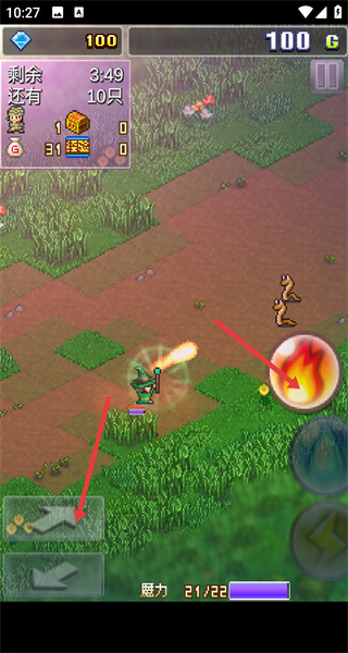 3、在冒險(xiǎn)場(chǎng)景,通過左下角移動(dòng)按鈕操控魔法師移動(dòng),點(diǎn)擊右側(cè)技能按鈕釋放魔法攻擊怪物。
