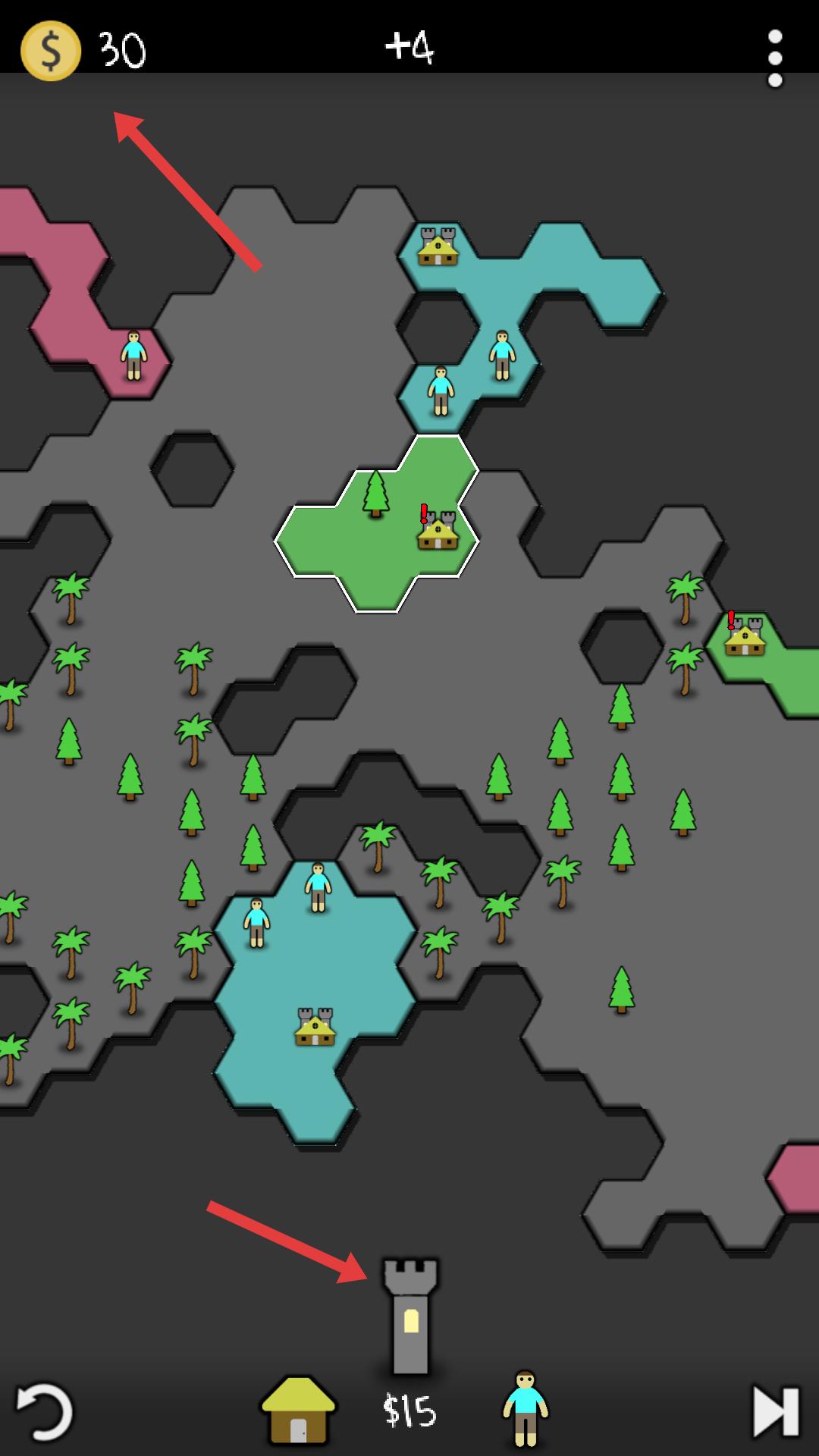 4、除雇傭人物外,還可花費金幣建造塔樓,塔樓可用于防御或擴張區(qū)域,同時要留意金幣的增減,合理規(guī)劃建筑和雇傭操作。
