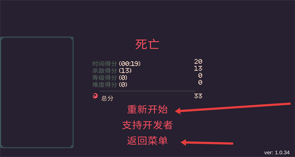 4、若不幸死亡結(jié)算界面會顯示時間殺敵等得分,想繼續(xù)挑戰(zhàn)同模式,點重新開始想換模式或調(diào)整策略選返回菜單,多嘗試不同路線戰(zhàn)斗節(jié)奏提升生存時長與總分。