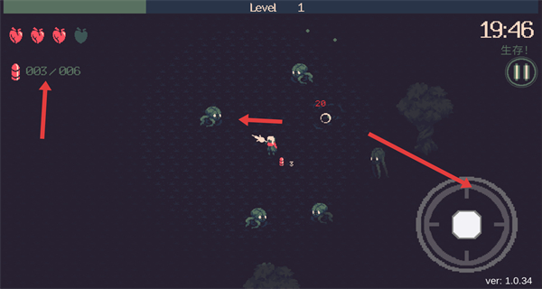 3、遭遇怪物看準時機點擊右側(cè)射擊按鈕攻擊,優(yōu)先解決數(shù)量多移動快的敵人,注意彈藥消耗左上角彈藥數(shù)減少時及時找彈藥箱補充,沒彈藥會陷入被動被怪物消耗血量。