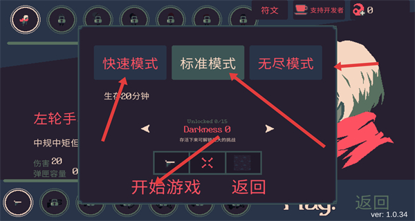 1、進入游戲后在模式選擇界面,快速模式生存時長短適合練手標準模式是常規(guī)體驗,新手建議先選標準模式點擊開始游戲,開啟20分鐘生存挑戰(zhàn),熟悉戰(zhàn)斗與資源管理。