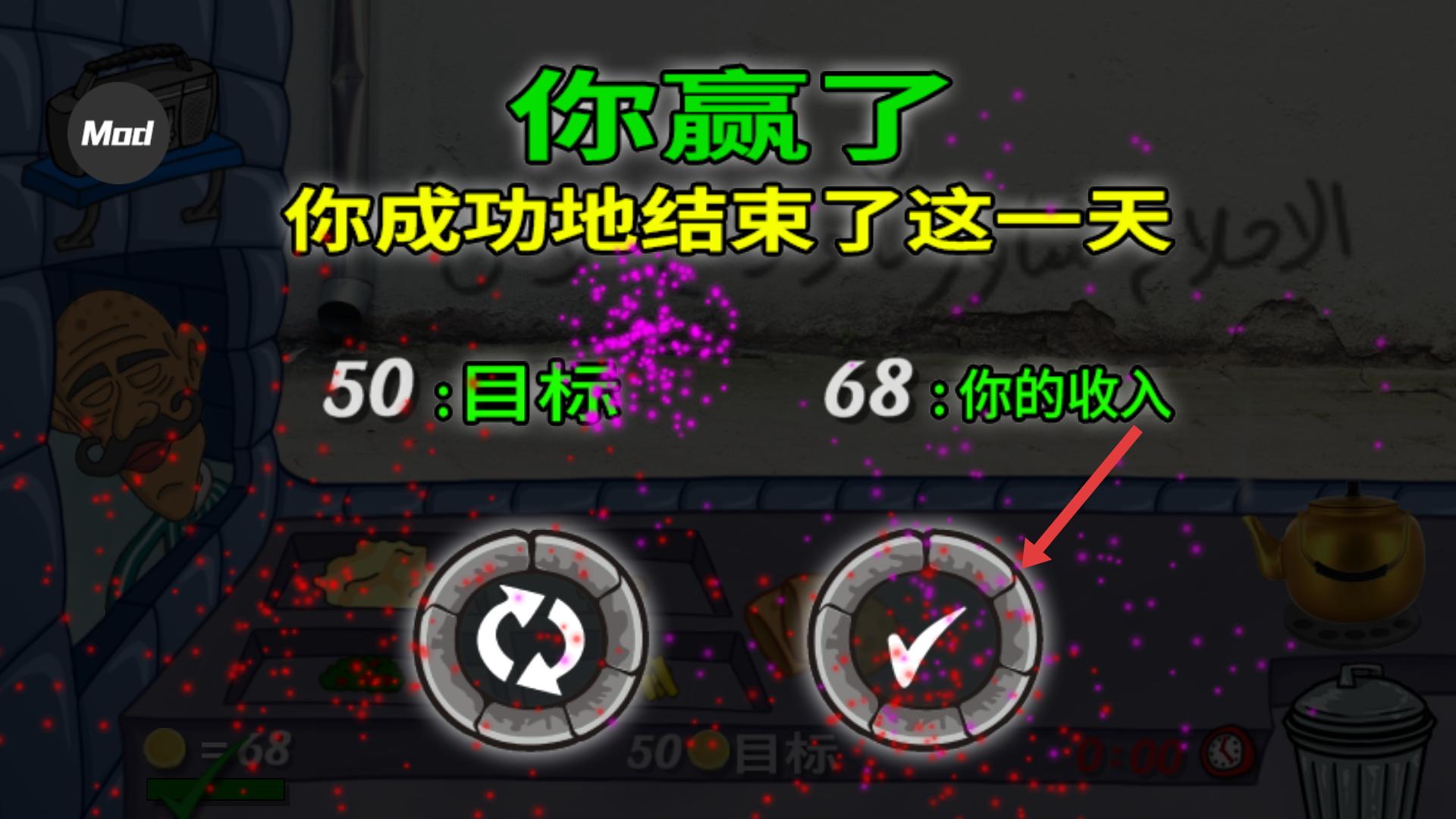 4、當(dāng)收入達(dá)到并超過目標(biāo)后,會(huì)出現(xiàn)你贏了的結(jié)算界面,此時(shí)點(diǎn)擊帶有對(duì)勾的按鈕即可結(jié)束當(dāng)天經(jīng)營,繼續(xù)后續(xù)的游戲進(jìn)程。