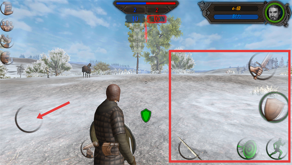 4、進(jìn)入戰(zhàn)斗后界面有操作按鈕,左側(cè)可控制角色移動(dòng),右側(cè)有武器、盾牌、瞄準(zhǔn)、奔跑等功能按鈕,熟悉這些操作即可開始游戲戰(zhàn)斗。