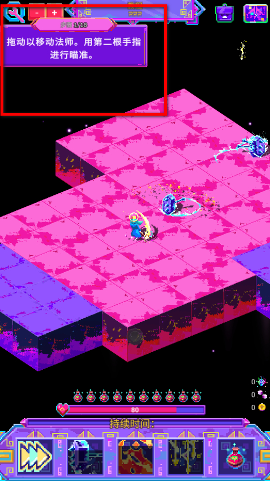 1、拖動(dòng)屏幕移動(dòng)法師,用另一根手指瞄準(zhǔn),操控法師在方塊場(chǎng)景里移動(dòng)戰(zhàn)斗,按提示完成移動(dòng)和瞄準(zhǔn)的操作,熟悉操作后能更靈活應(yīng)對(duì)敵人。