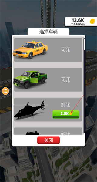4、進入車輛選擇界面,看到可解鎖的直升機選項,點擊消耗2.5K金幣的解鎖按鈕,嘗試解鎖新的交通工具,拓展游戲玩法,開啟直升機破壞的新體驗。