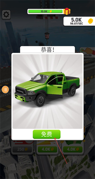 2、升級后彈出新車解鎖提示,點擊免費按鈕,領(lǐng)取綠色皮卡車,獲得新車輛用于游戲,讓你在車輛破壞過程中有更多選擇,體驗不同車輛的破壞效果。