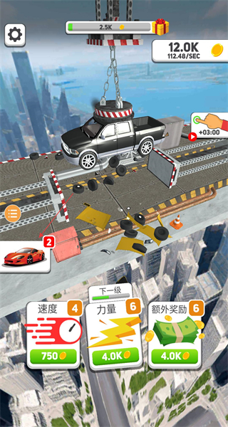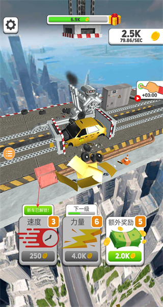 1、打開汽車墳場,看到新車已解鎖提示,點擊速度升級選項,消耗金幣提升車輛速度,讓車輛在破壞過程中更具優(yōu)勢,為解鎖新車和后續(xù)游戲進展奠定基礎(chǔ)。