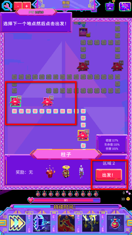1、在地圖界面選好區(qū)域后點(diǎn)擊出發(fā),進(jìn)入新區(qū)域前要確認(rèn)好目標(biāo)區(qū)域,點(diǎn)擊出發(fā)按鈕開(kāi)啟新的冒險(xiǎn)篇章,去挑戰(zhàn)不同的敵人和場(chǎng)景。