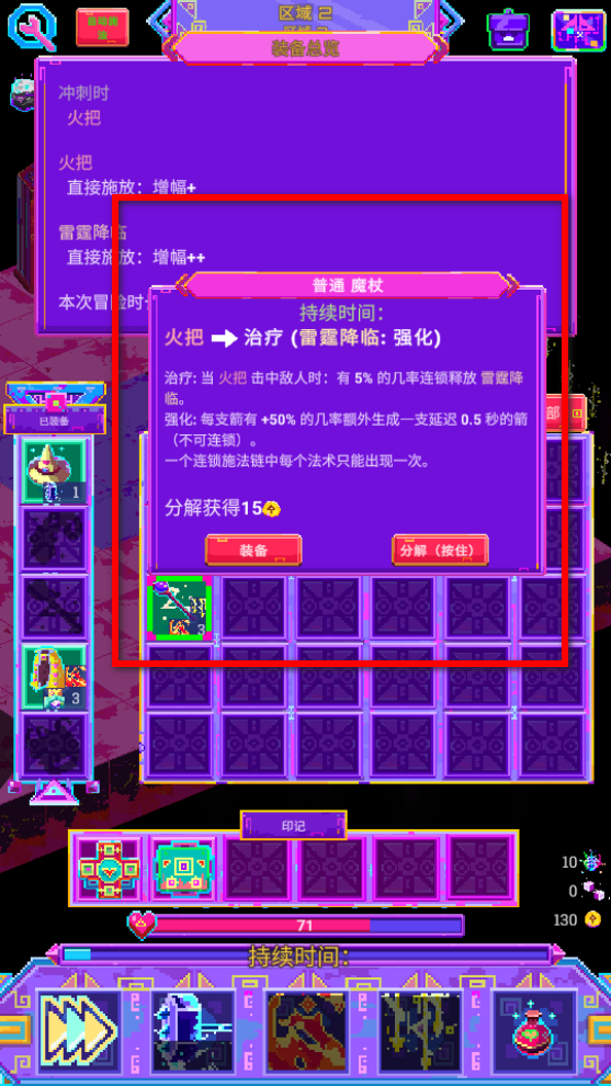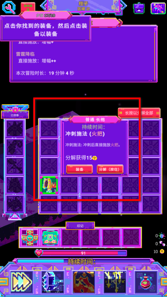 2、點(diǎn)擊找到的裝備然后點(diǎn)擊裝備以裝備,找到裝備后點(diǎn)擊它,再點(diǎn)擊裝備按鈕就能穿上,穿上裝備能提升法師的能力,讓冒險(xiǎn)更輕松。
