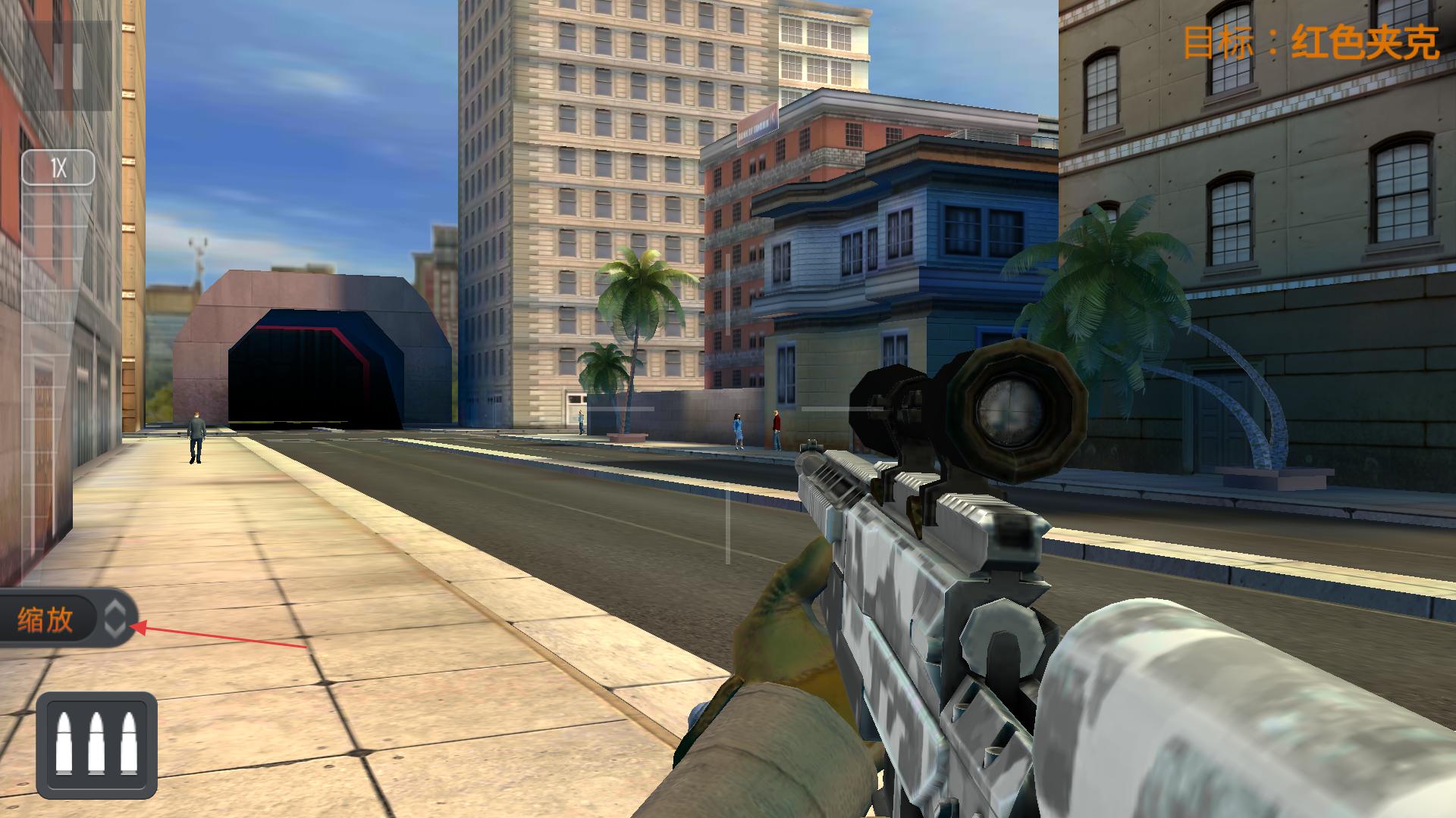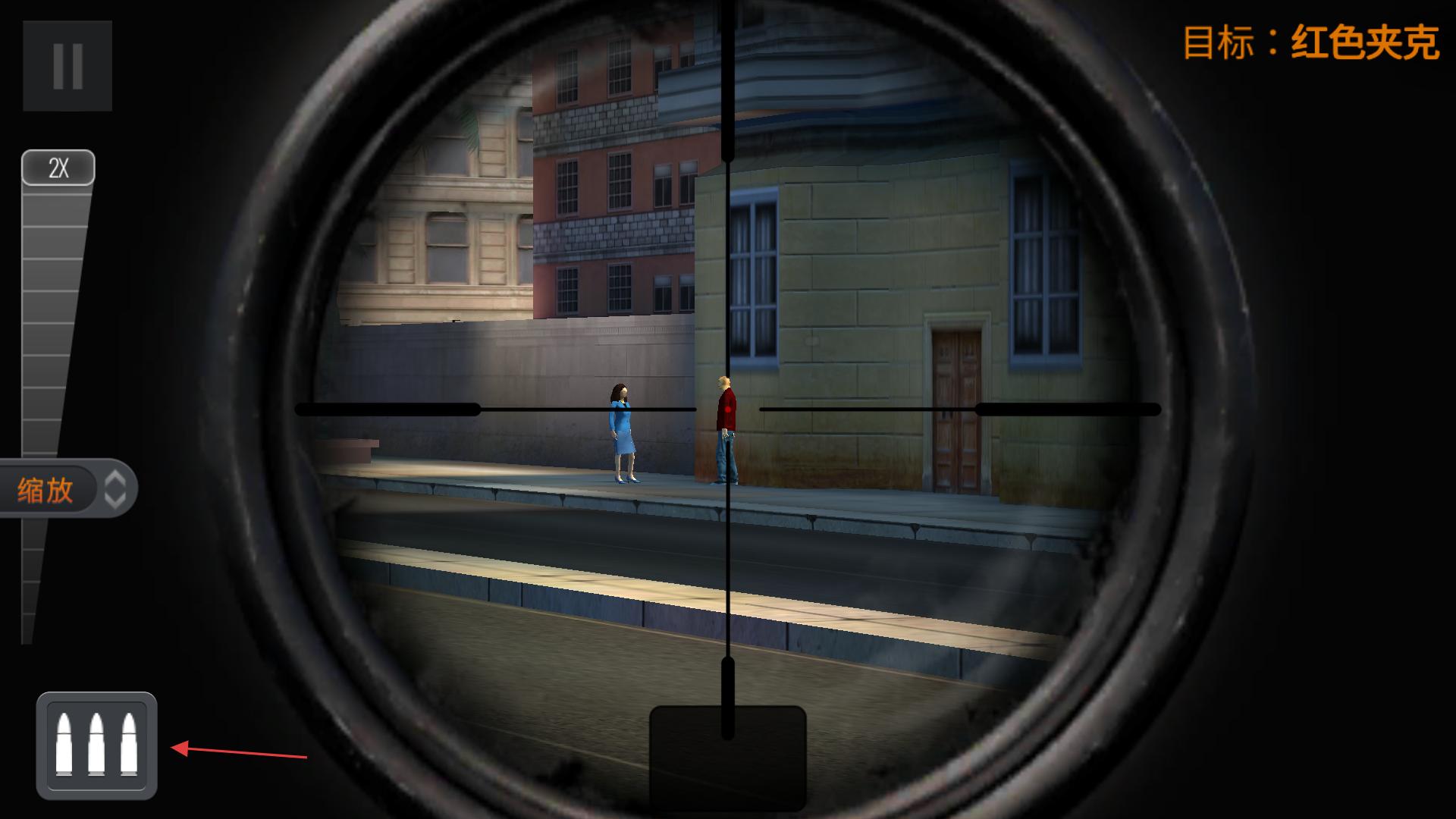 3、調(diào)整好狙擊鏡后,瞄準(zhǔn)穿紅色夾克的目標(biāo),確認(rèn)目標(biāo)后進(jìn)行射擊,完成干掉目標(biāo)的任務(wù)要求,順利推進(jìn)游戲進(jìn)程,體驗狙擊的操作樂趣。