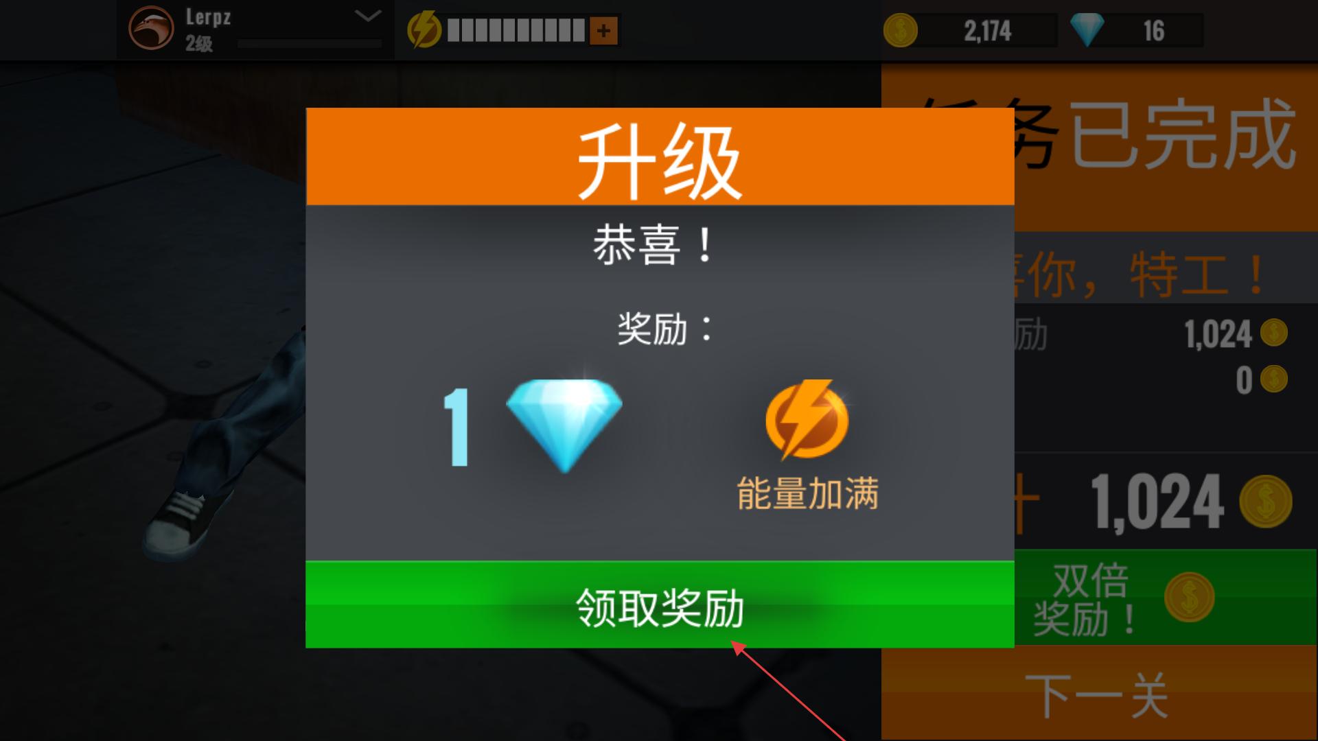 4、任務(wù)完成后,彈出升級獎勵界面,點擊領(lǐng)取獎勵按鈕,獲得鉆石和能量獎勵,提升游戲等級,為后續(xù)任務(wù)和游戲玩法拓展提供資源支持。