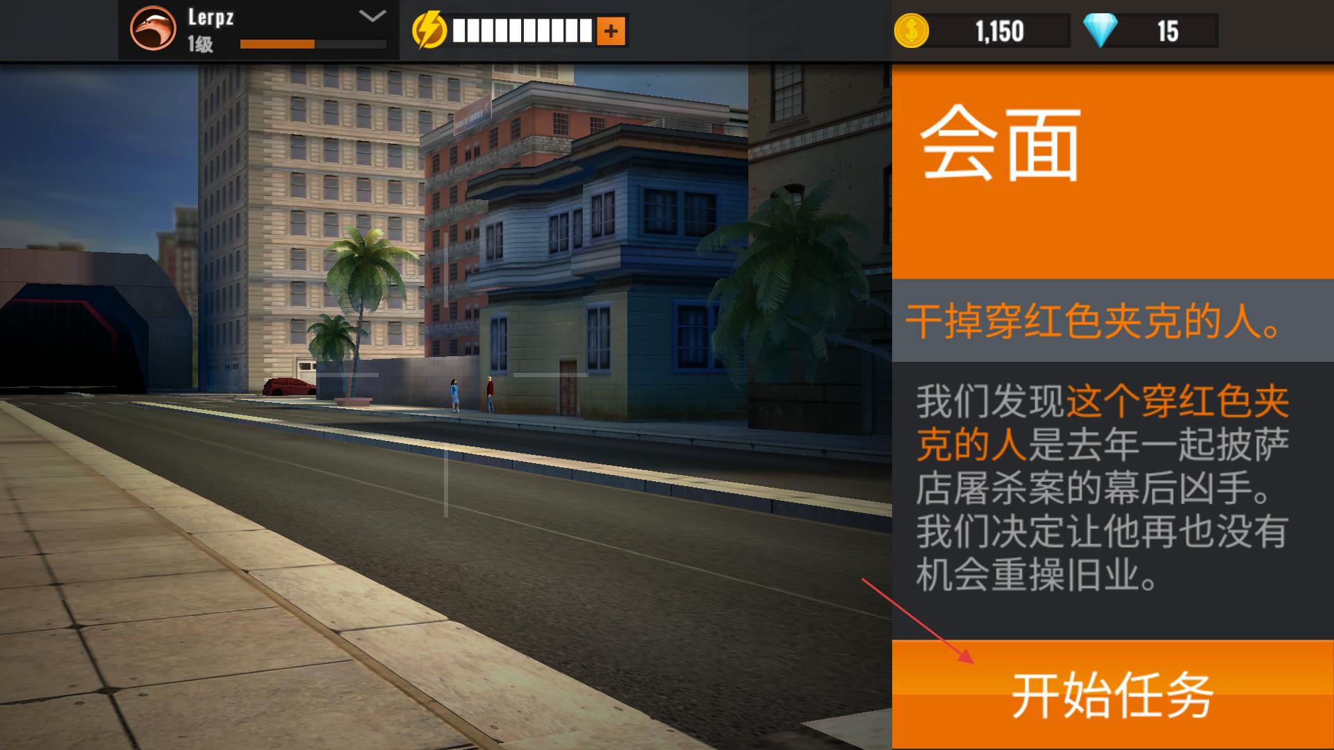 1、打開游戲后,看到會面任務(wù)界面,點擊開始任務(wù),進(jìn)入狙擊場景,此操作開啟任務(wù)流程,讓你能執(zhí)行干掉穿紅色夾克的人的任務(wù),為后續(xù)狙擊操作鋪好路。