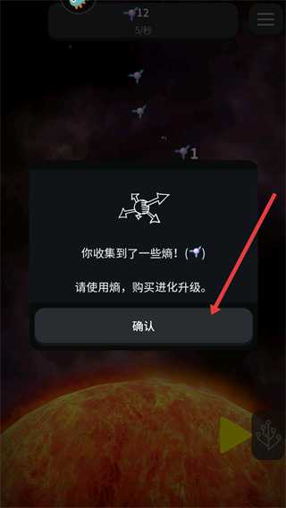 2、收集熵后點擊確認使用熵購買進化升級,提升星球的進化能力推進游戲進程。
