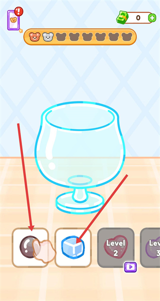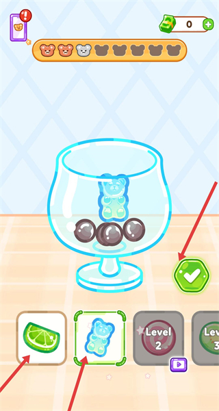 3、玩家需要繼續(xù)添加特色材料如青檸和小熊軟糖完善飲料的制作,完成后點擊綠色對勾確認(rèn)制作步驟。