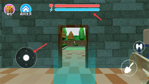 2、利用左側(cè)方向輪盤移動(dòng)關(guān)注上方的生命和體力條,在場(chǎng)景中探索尋找挖寶的區(qū)域。