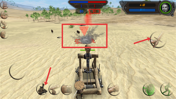 3、在沙漠場景中操作投石車時,點擊左側(cè)投石車圖標(biāo),調(diào)整瞄準(zhǔn)后發(fā)射,可對敵人造成范圍傷害,利用投石車能有效打擊遠(yuǎn)處敵人。