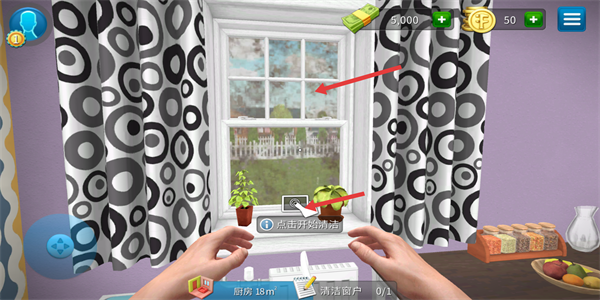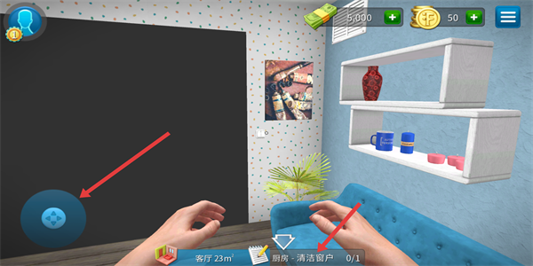 1、操控移動按鈕在房間內移動,查看任務提示,明確需完成的家居任務,如清潔窗戶等,為后續(xù)操作明確方向。